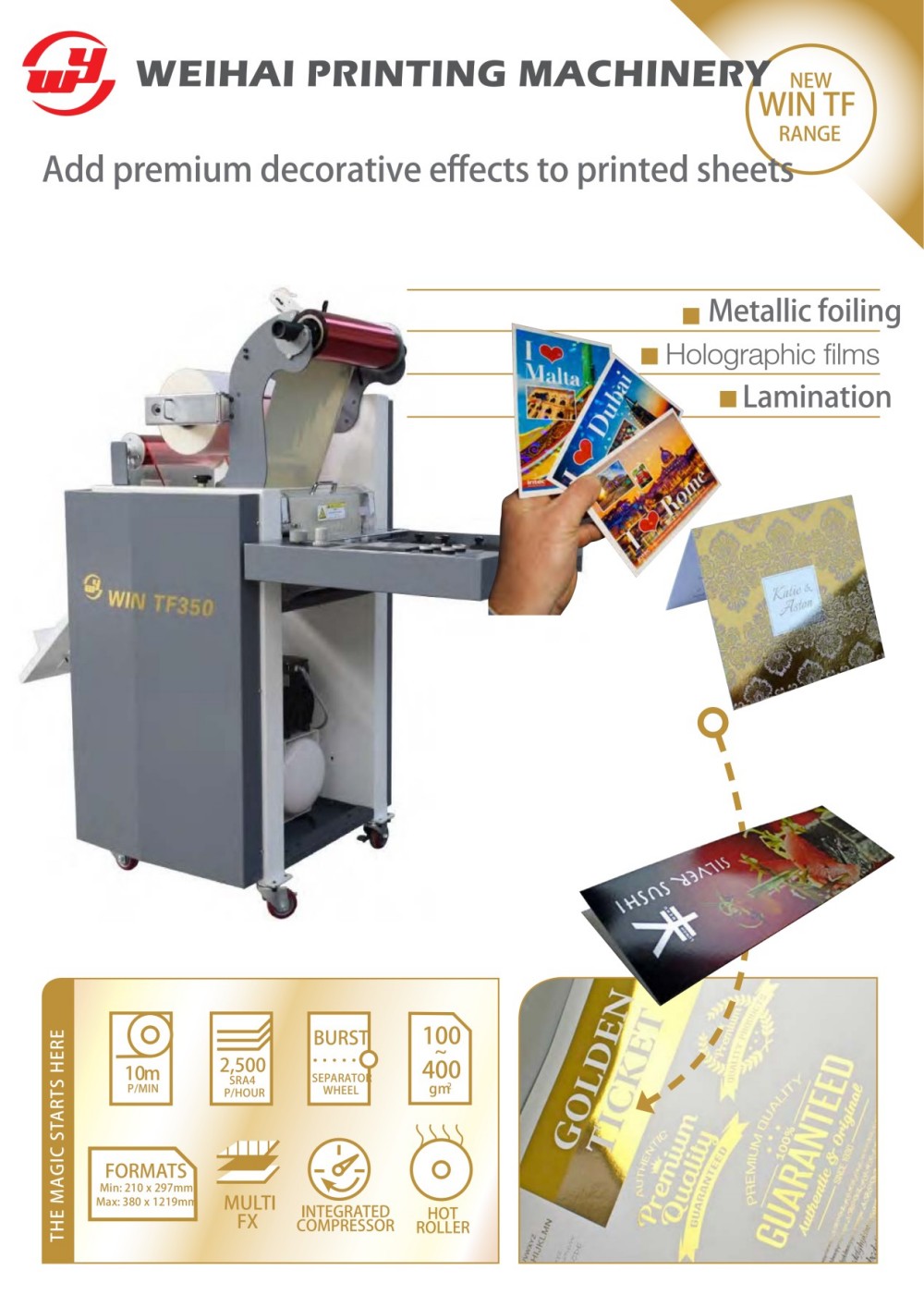 威海印刷機械有限公司が設計・製造した製版不要のラミネート・箔貼り機は、手動給紙式のラミネート・金属箔貼り機です。コンパクトな設計により、ラミネート機能と金属箔加工機能の両方を搭載しながらスペースを節約できるため、社内で装飾的なタッチを追加したい企業に最適です。通常の印刷物を精巧な完成品に変え、デジタル オンデマンド アプリケーションと従来の石版オフセット印刷の両方でシームレスに動作します。最良の結果を得るために、動作中のローラー圧力と加熱温度を調整する電子制御装置が装備されています。これらの調整は、走行速度、紙の厚さ、デザイン パターンなどの要素に基づいて行われます。この機械は、一流の製版不要のホットスタンプおよびラミネートツールであることが証明されており、お客様が製品に大きな価値を付加するのに役立ちます。また、ラミネートフィルムや金属箔も豊富に取り揃えておりますので、あらゆる装飾ニーズにお応えできます。さらに、バナーや非常に長い印刷物に最適な拡張給紙テーブルを備えています。